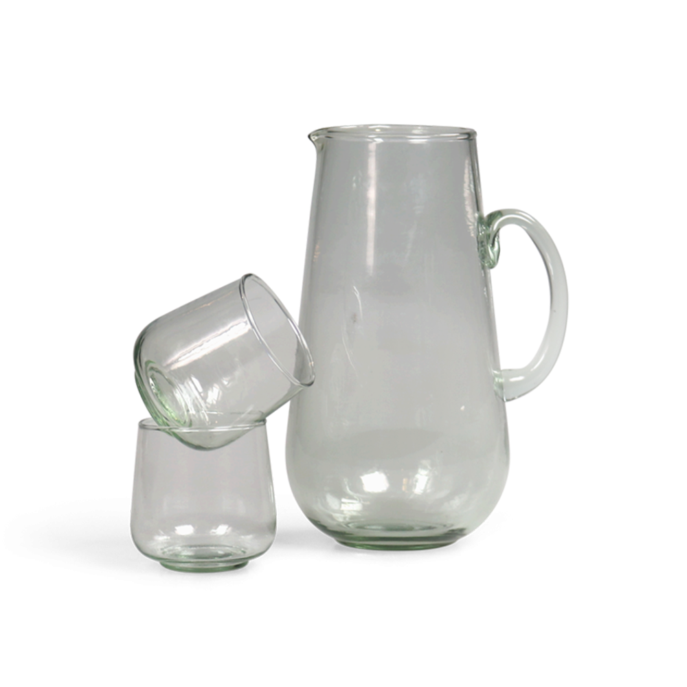 Minimalisme ontmoet functionaliteit met de Karaf Puur. Deze set, bestaande uit een elegante schenkkaraf met een stevig oor en twee bijpassende glazen, straalt rust en eenvoud uit. Het glas heeft een subtiele groene zweem, wat doet denken aan ambachtelijk gerecycled glaswerk. Of het nu gaat om een zomerse karaf water met citroen of een goede fles wijn, met deze set serveer je elk drankje met een natuurlijke elegantie.