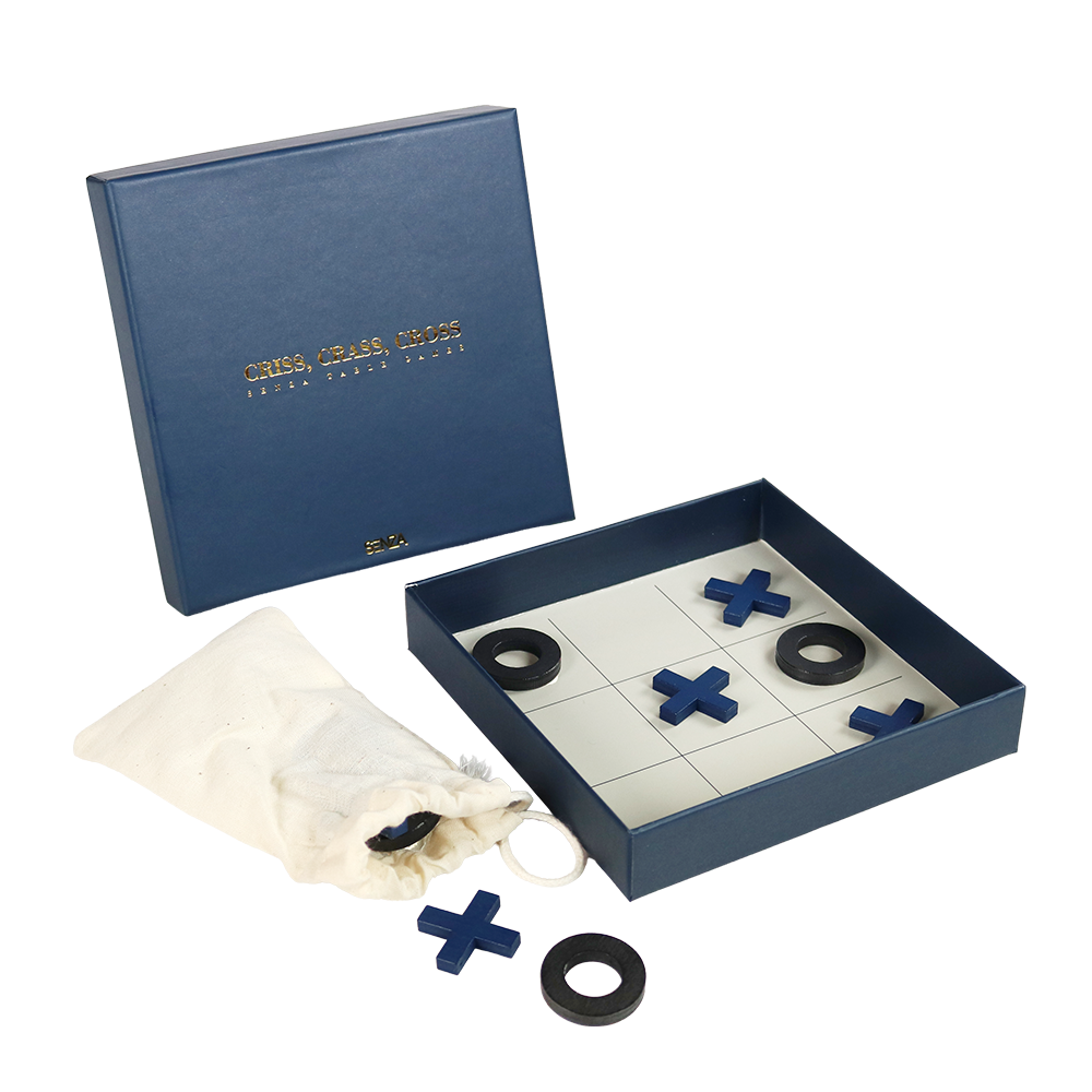 Breng een klassieker naar een hoger niveau met de Criss Cross Cross set. Dit is niet zomaar een spelletje boter-kaas-en-eieren; het is een stijlvol woonaccessoire. De set wordt geleverd in een diepblauwe, luxe geschenkdoos met gouden bedrukking. De speelstukken berg je eenvoudig op in het bijgeleverde katoenen zakje. Of je het nu op de salontafel laat liggen als decoratie of meeneemt op reis, dit spel staat garant voor elegant speelplezier.