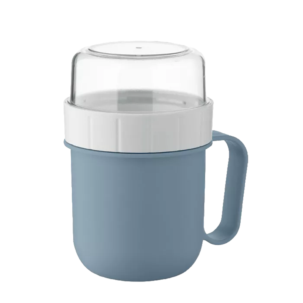 Ontbijt of lunchbeker voor onderweg, gemaakt van PP en PS. De beker bevat twee aparte bakjes om ingrediënten gescheiden te houden. Praktisch en handig voor dagelijks gebruik.