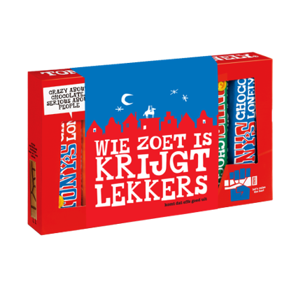 Heerlijk proeverijtje van de Sint (& Tony). Zes lekkere Tony Chocolonely smaken. 288 Gram in totaal. Te bestellen vanaf 50 stuks.