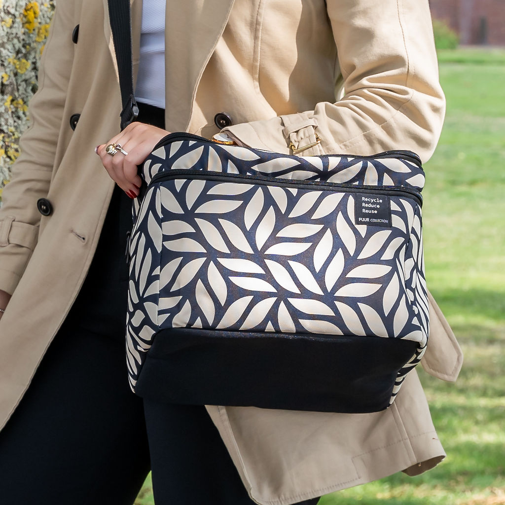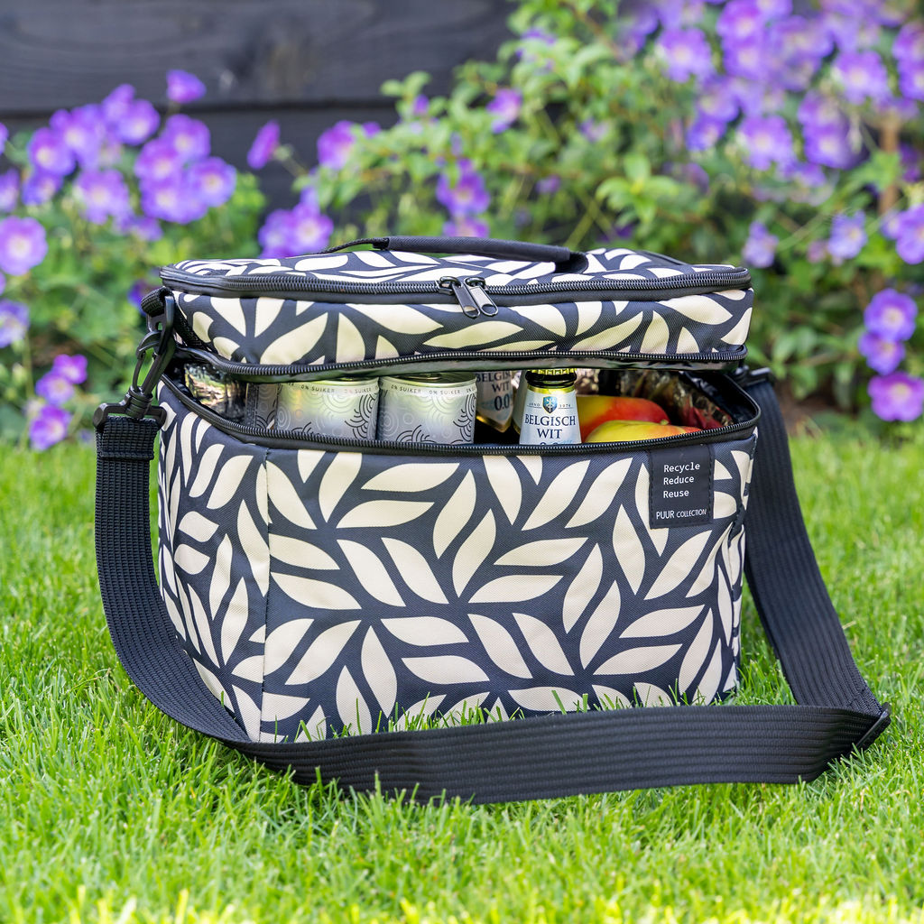 Ga stijlvol op pad met onze crème-zwarte koeltas met een mooie bladprint. Deze tas uit de PUUR-lijn is niet alleen hip, maar ook heel handig. De binnenkant is gevoerd met een zilverkleurig koelmateriaal, zodat je eten en drinken lekker koel blijft. De tas is gemaakt van gerecycled PET-plastic, dus je kiest ook voor een duurzame oplossing.