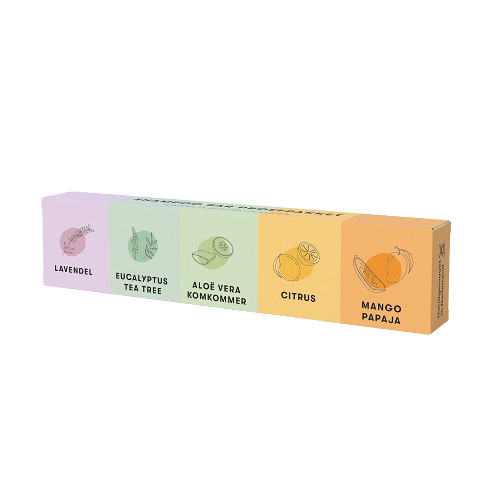 Het proefpakket bevat vijf mini Shampoo Bars van ca. 12 gram per stuk. Perfect om kennis te maken met de bars. Met elke bar kun je gemiddeld 10 tot 15 wasbeurten doen, afhankelijk van haartype en gebruik.