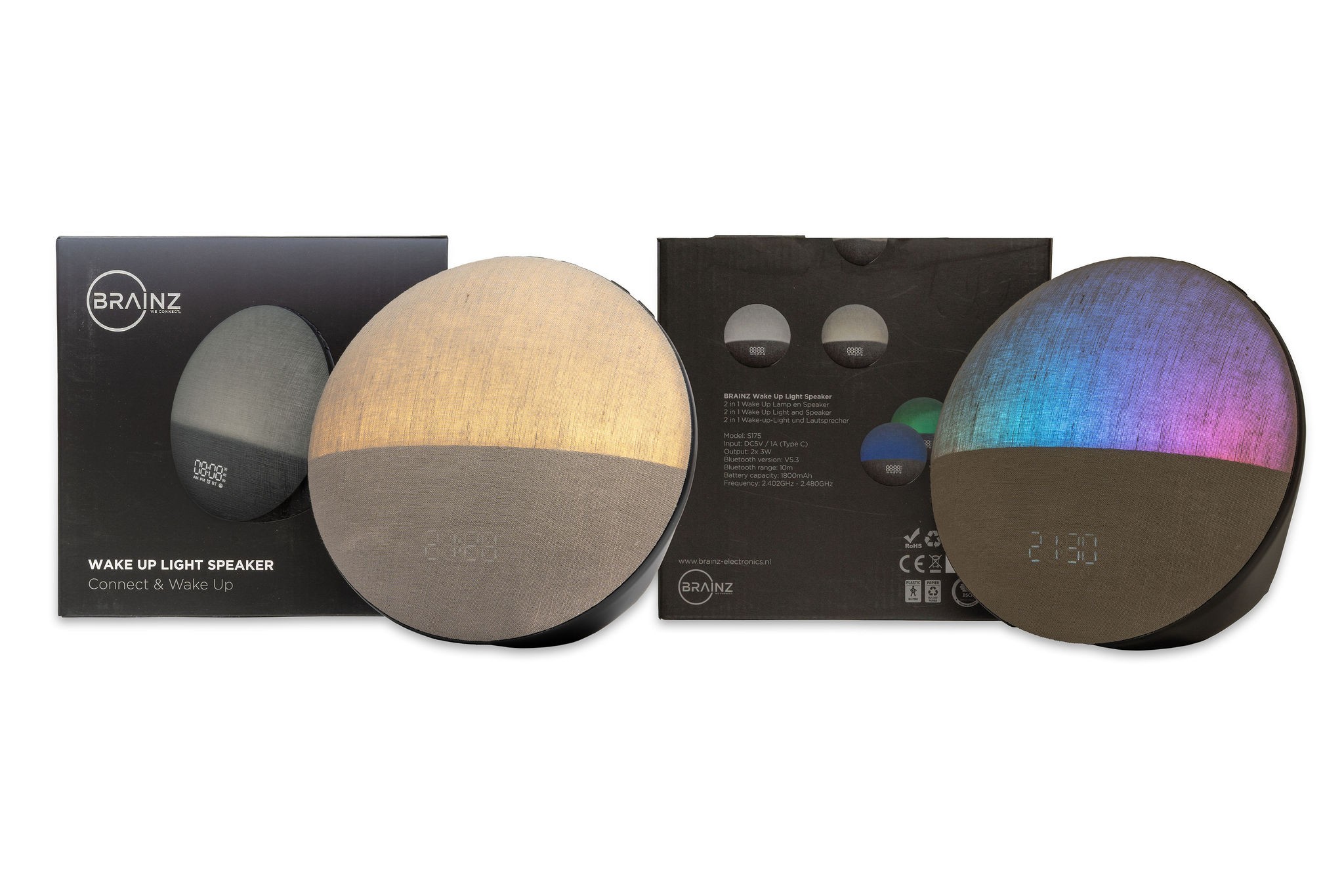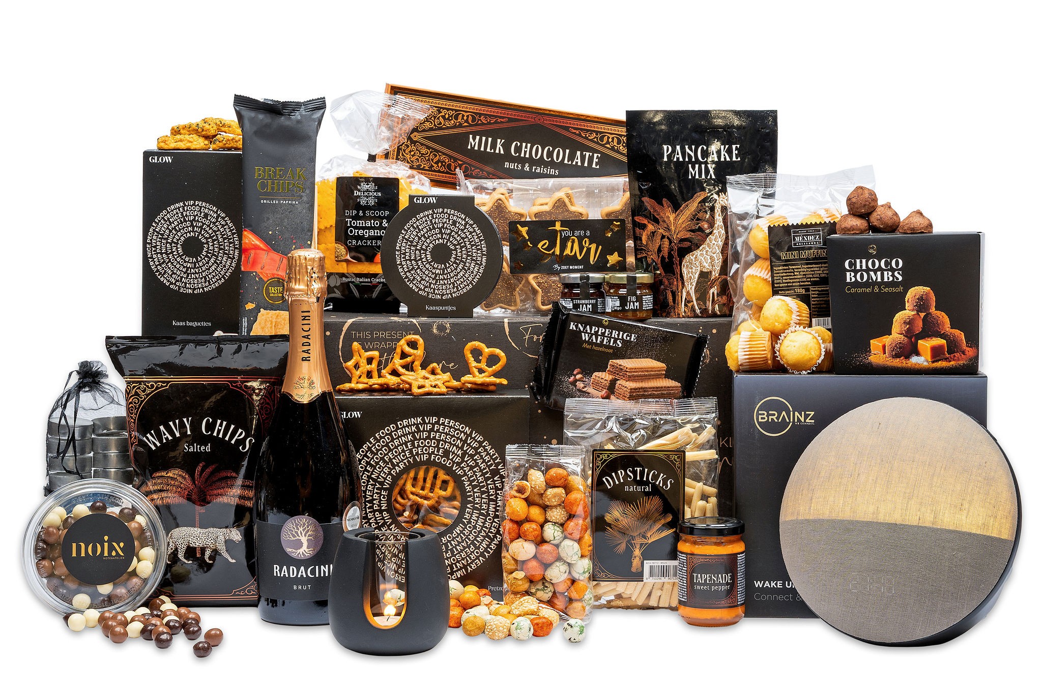Super de luxe kerstpakket: wake up light, trendy theelichthouder, heel veel lekkers en bubbels.